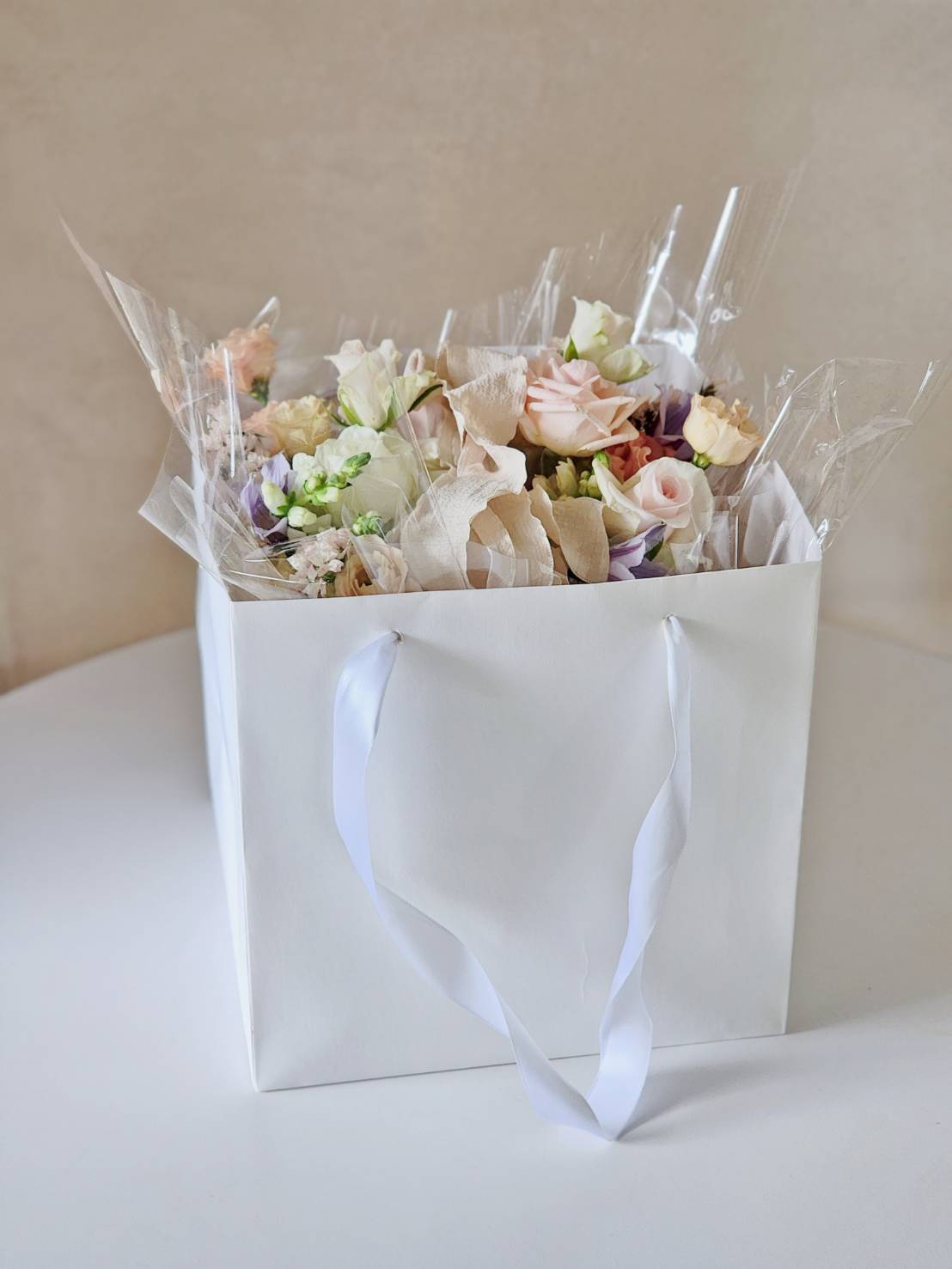 為保花況,捧花使用前放在冰箱內保存為最佳,或放置強力冷氣房內,避免花朵受熱
